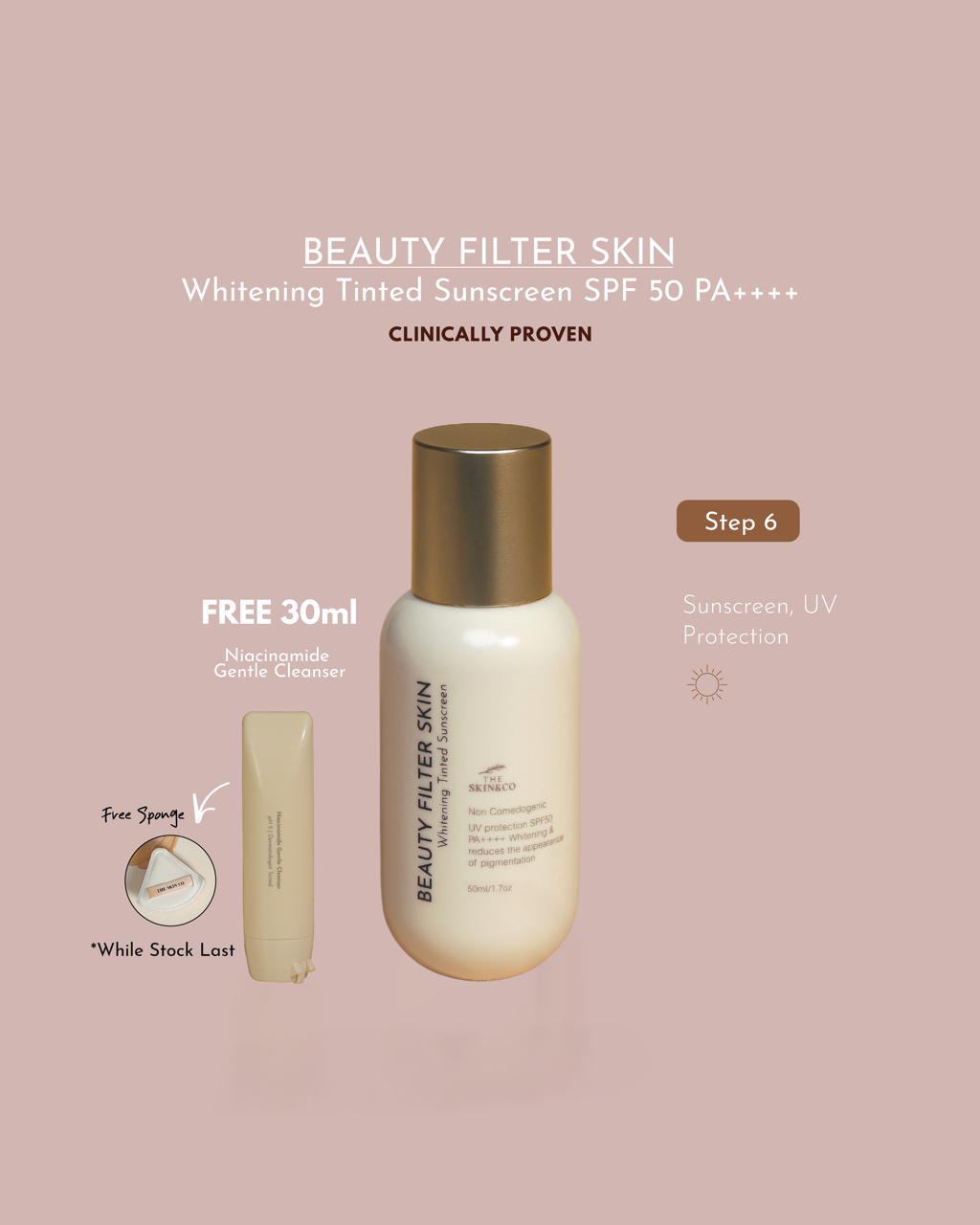 Beauty Filter Whitening Tinted Sunscreen SPF50 PA++++ is a hybrid sunscreen that combines chemical (Ethylhexyl Methoxycinnamate, Butyl Methoxydibenzoylmethane, Octocrylene) and mineral (Titanium Dioxide) UV filters for broad-spectrum protection against UVA & UVB rays.